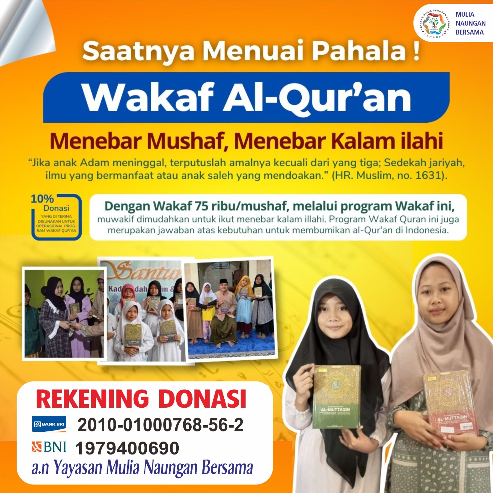AWakaf Al Quran adalah perbuatan sosial yang mulia dengan mewakafkan mushaf Al Quran untuk dihibahkan kepada umat Islam agar dapat dibaca, dipelajari,